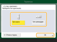 1 | Нажмите кнопку <Стирание рамки книги> и задайте параметр <Формат оригин.>. ![]() Если размер, отображаемый для параметра <Формат оригин.>, отличается от заданного формата книги, нажмите кнопку <Изменить>, чтобы выбрать размер. Режим «Стирание рамки книги» можно использовать только для форматов оригинала, указанных на сенсорном дисплее. |