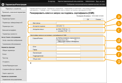 Сертификаты, созданные на аппарате, не имеют цифровой подписи CA, что может вызвать ошибки во время обмена данными с некоторыми кэширующими узлами. Чтобы запросить сертификат с цифровой подписью CA, необходимо создать запрос на подпись сертификата (CSR). Создать запрос CSR может пользователь, вошедший в систему аппарата с полномочиями администратора.