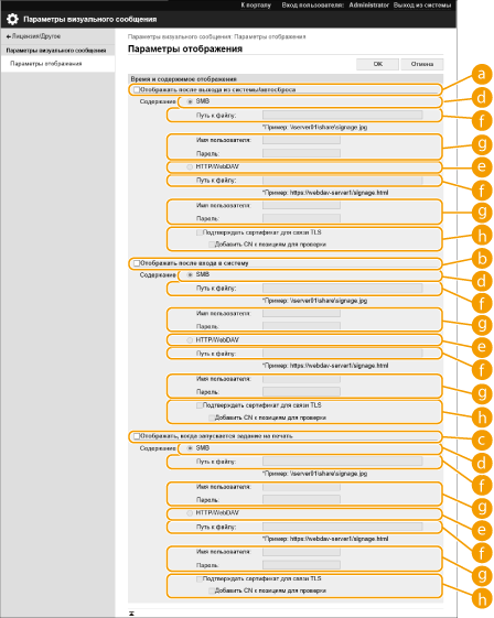 Если установлена функция «Визуальное сообщение», отправляемое содержимое можно проверить в разделе <Визуальное сообщение> на экране (Главный) независимо от указанного выше времени.Задайте в качестве отображаемого содержимого файл, сохраненный на файловом сервере или в Advanced Box другого многофункционального аппарата Canon в той же сети. Использование других аппаратов и устройств памяти В качестве содержимого также можно установить веб-сайт через прокси-сервер. Параметры прокси-сервера, используемые для этой функции, соответствуют параметрам в <Параметры Proxy>. Содержимое отображается при начале печати, если включена функция принудительной отложенной печати и установлен флажок [Display When Print Job Starts]. |