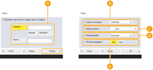 2 | Натиснете <Задав. на Детайли> и задайте настройките, както е необходимо. ![]() <Подадрес>/<Парола>Задайте, когато изпращате или получавате документи, за да повишите защитата, като присъедините подадрес и парола към всички ваши факс трансакции. Основни операции за изпращане на факсове <Скорост на изпращ.>В зависимост от факс машината на получателя или състоянието на линията може да възникна грешка в предаването, дължаща се на скоростта на предаване. Ако често възникват грешки, намалете стойността на тази настройка. <Избор на линия>Ако имате допълнителни телефонни линии, можете да изберете линията, използвана за изпращане на факс. <Международни>Ако често възникват грешки в предаването, когато извършвате обаждания до чужбина, изберете <Междунар. (1)>. Ако грешките продължават, променете настройката на <Междунар. (2)> или <Междунар. (3)>. <РКГ при изпращане>Изберете <Вкл.> за коригиране на грешки в изображенията. Изберете <Изкл.>, ако факс машината на получателя не поддържа режима за коригиране на грешки (ECM). ![]() За да изпращате факсове чрез ECM, трябва също да зададете <Настройки на факса> <РКГ при изпращане> на <Вкл.>.![]() Макар че има елементи, които можете да зададете в настройките за факс (Екран с основни функции за факс), удобно е да ги зададете тук, ако искате да промените условията на изпращане за всяка дестинация. Задайте <Авт. настр. скоростта на комун. при използв. на VoIP> да бъде <Вкл.>, за да изпращате и получавате факсове по-точно, когато линията или другата страна са предразположени към грешки. Ако зададете <Вкл.> за тази настройка, скоростта на комуникация се ограничава до 14 400 bps или по-малко, което намалява грешките. |