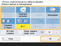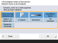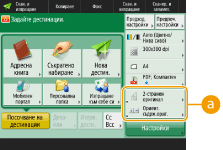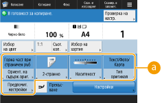 Броят на елементите за настройка, намиращи се в екрана с основни функции, и местоположението им на показване се различават в зависимост от функцията. Бутон за пряк път не се показва, ако <Не е присъединен> е зададено като пряк път. Ограниченията за броя на преките пътища за <Настройки>, които можете да регистрирате, са следните: Копиране: 5 Факс: 4 Сканиране и изпращане: 2 |