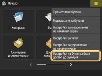 Можете да създадете бутон за пряк път до функциите на екрана <Начало>. Използвайте този бутон за достъп до различна функция, без да се връщате в екрана <Начало>. За да създадете пряк път, влезте с права на администратор. Вход в системата на машината