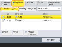 Натискането на <Детайл> <Повторно изпращане> ви позволява да изпратите повторно документите, които не са успели да бъдат изпратени. За задаване на друга дестинация натиснете <Промяна на дестинация>. За документи с множество дестинации, посочени с използване на един и същ метод на изпращане, натиснете <Списък Разпращане>, изберете дестинация и след това натиснете <Повторно изпращане> или <Промяна на дестинация>.Можете да изпратите повторно документи, ако <Изтриване неизпълнени задачи за изпращ.> е зададено на <Изкл.> (<Изтриване неизпълнени задачи за изпращ.>). Имайте предвид, че не можете да изпращате повторно документите, изпратени с Директно изпращане/Ръчно изпращане/Факс от компютър. Можете да променяте дестинациите на документи, които са зададени да бъдат изпращани в посочен час, както и на документи, които не са успели да бъдат изпратени. Имайте предвид, че не можете да променяте дестинациите за документи със зададени множество дестинации, които се изпращат или когато въвеждането на нова дестинация е ограничено (Ограничаване на достъпните дестинации). Дестинацията може да се променя за задача, която е отменена поради грешки при предаването, или за задача, която изчаква изпращане в режим на Отложено изпращане. Не можете да променяте множество дестинации едновременно. Също така не можете да променяте дестинациите в дадена група едновременно. |