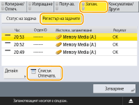 За документи, изпратени по имейл, този списък показва резултатите от обмена на данни между машината и имейл сървъра, а не между машината и дестинацията. Ако изберете <Задав. изход. Бр. изпращ.> в стъпка 3, може да зададете броя резултати от регистъра, които да се виждат в списъка. Може да зададете дали този списък да се отпечатва автоматично, или не. |