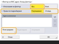 За <Права по подразбиране> изберете <Отхвърляне> за позволяване на комуникация само с устройства, които имат МАС адрес, посочен в <Адреси изключения> в следващата стъпка, или изберете <Разрешав.> за отхвърляне на комуникацията с тях.