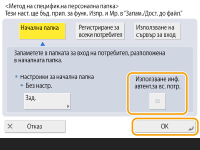 Личната папка е папка, споделена от следните екрани. <Сканиране и изпращане> <Мрежа> в <Сканиране и запаметяване> <Мрежа> в <Достъп запм.файлове> |