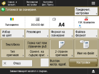Този екран се появява при натискане на <Настройки> на екрана с настройки за сканиране в <Сканиране и запаметяване>. Той ви позволява да конфигурирате настройките за сканиране на оригиналите по-ясно.