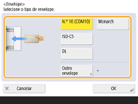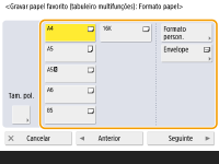 Se programar <Especificar sempre> em <Pré-programações tabuleiro multifunções> para <Papel favorito>, aparece um ecrã que permite selecionar o seu "Papel favorito" quando colocar papel no tabuleiro multifunções. <Pré-programações tabuleiro multifunções>