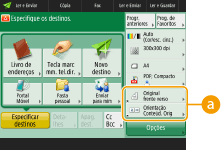 O número de itens de programação que se encontra no ecrã das funções básicas e a localização a ser apresentada diferem dependendo das funções. Não é apresentado nenhum botão de atalho se <Unassigned> for programado como atalho. O limite de atalhos para <Opções> que pode gravar é o seguinte. Copiar: 5 Fax: 4 Ler e Enviar: 2 |
