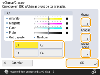 Pode gravar até quatro programações após o ajuste. Depois de ajustar a cor, carregue em <Chamar/Gravar> selecione um botão de <C1> a <C4> carregue em <Gravar> <Yes> <OK>.![]() ![]() Para chamar programações gravadas, carregue em <Chamar/Gravar>, selecione um botão e carregue em <OK>. Pode alterar o nome dos botões de <C1> a <C4>. Selecione o botão que pretende alterar, carregue em <Mudar nome> e introduza um novo nome. Para apagar programações gravadas, selecione o botão carregue em <Delete> <Yes>. |