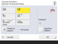 <PDF; Compacto> ou <XPS; Compacto> só é válido com as seguintes programações: Selecionar cor: Modo de cor diferente do modo Preto e branco Resolução: 300 dpi x 300 dpi Só é possível enviar documentos do <Word> nos quais <OOXML> esteja programado utilizando as programações seguintes. Selecionar cor: Modo de cor diferente do modo Preto e branco Resolução: 300 dpi x 300 dpi Só é possível enviar documentos do <PowerPoint> nos quais <OOXML> esteja programado utilizando as programações seguintes. Selecionar cor: Modo de cor diferente do modo Preto e branco Resolução: 300 dpi x 300 dpi ou 600 dpi x 600 dpi Ao criar ficheiros por páginasPara fazer a leitura de um original de várias páginas e guardar cada página como um ficheiro separado, em vez de guardar todas as páginas como um só ficheiro, carregue em <Dividir em páginas>. Para especificar o número de páginas que pretende incluir em cada ficheiro, especifique o número de páginas pretendido depois de carregar em <Dividir em páginas>. Para guardar cada página como um ficheiro separado, especifique <1> para o número de páginas. Se selecionar <TIFF/JPEG>, cada página será criada automaticamente como um ficheiro separado de acordo com o modo Selecionar cor. Quando Preto e branco está programado para o modo Selecionar cor: TIFF Quando uma programação diferente de Preto e branco está programada para o modo Selecionar cor: JPEG