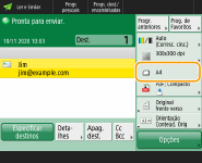 Para verificar o número total de destinos especificadosO número total de destinos especificados é apresentado na parte superior direita do ecrã. Isto permite-lhe confirmar se o número de destinos está correto antes do envio. Para cancelar imediatamente um trabalho que está a ser enviadoSe carregar em  (Parar) no painel de controlo enquanto um trabalho está a ser enviado, é apresentada a mensagem <Cancelar o trabalho de envio seguinte?>. Carregue em <Sim> para cancelar o envio. Carregue em  (Parar) quando existirem vários trabalhos de envio para apresentar o ecrã para selecionar o trabalho a cancelar. Se o trabalho de envio que pretende cancelar não for apresentado, carregue em <Verif. outros trabalhos> para apresentar <Trbs envio>. Selecione o trabalho que pretende cancelar e carregue em <Cancelar>. Para verificar os estados de documentos enviados/gravadosNo ecrã <Contr. estado>, pode verificar os estados dos documentos enviados/gravados. Este ecrã permite enviar/gravar documentos novamente ou cancelar a operação de enviar/gravar após a verificação dos estados. Verificar o estado e o registo de documentos lidosSe o item <Mostrar notificação quando trabalho for aceite> for programado para <Ligado>, é possível aceder ao ecrã <Contr. estado> a partir do ecrã seguinte que é mostrado após a receção de um trabalho de envio. <Mostrar notificação quando trabalho for aceite>Para imprimir o relatório dos resultados de enviar/gravarNo ecrã de funções básicas de leitura, carregar em <Opções>  <Relatório result. TR> permite programar a impressão automática do relatório com os resultados de envio/guardar. Para programar isto para cada trabalho em <Opções>, tem de selecionar <Só para erros> ou <Desligado> em <Relatório result. TR> e, em seguida, programar <Permitir a partir de Opções> como <Ligado>. Nome do arquivoQuando um ficheiro é enviado/gravado, o nome do ficheiro é programado automaticamente com base no formato seguinte. É possível alterar a programação para que seja atribuído um nome diferente. Programar o nome de um ficheiroSe enviar por e-mail Formato "Número do trabalho (quatro dígitos)_número de páginas (três dígitos).nome da extensão do ficheiro", por exemplo "1042_001.jpg" Se gravar num servidor de ficheiros Formato "o ano, mês, dia, hora, minuto e segundo em que o ficheiro é gravado (14 dígitos).nome da extensão do ficheiro", por exemplo "20151030133541.jpg" Assunto da mensagem de correio eletrónico |