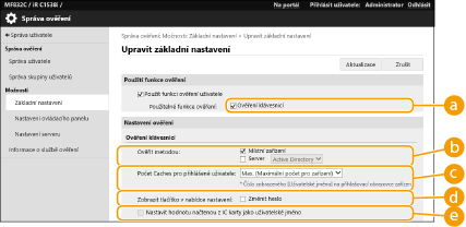 Chcete-li deaktivovat funkci integrovaného ověření přístupových práv pouze pro přihlášené uživatele zaregistrované v místním zařízení, zaškrtněte políčko pro [Zakázat integrované ověření pomocí bezpečnostních údajů pro ověření místního zařízení].