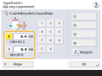 Nyomja meg az <X> vagy az <Y> lehetőséget, majd adja meg az egyes oldalak hosszát a számbillentyűk segítségével. ![]() Ha regisztrálja a gyakran használt papírméreteket az <S1>–<S4> közötti gomboknál, akkor egyszerűen megnyomva előhívhatja őket. Szabad méretű papír bejegyzése (egyedi méretű papír) | |