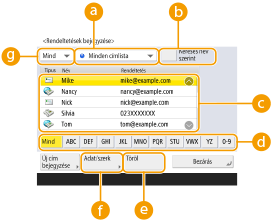 <Keresés név szerint>Adja meg a rendeltetési hely nevét. Az előző képernyőre lépéshez nyomja meg ismét a <Keresés név szerint> gombot.