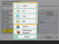 Válassza a <Fax>, <E-mail>, <I-Fax>, vagy <Fájl> lehetőséget a bejegyezni kívánt rendeltetési hely típusaként. Rendeltetési helyek felvétele a címjegyzékbe