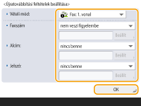 Az <Újratovábbítási beállítás> beállítása után a <Vételi mód> nem módosítható. Ha a továbbítási beállításokat másfajta <Vételi mód> mellett szeretné alkalmazni, újra meg kell adnia a továbbítási beállításokat. |