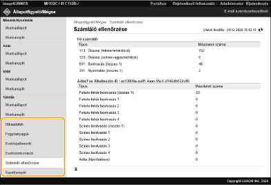 Számos különféle információt ellenőrizhet a készülékkel kapcsolatban, például a hibainformációkat, a maradék papír és festék mennyiségét, a csatlakoztatott kiegészítő berendezésekkel kapcsolatos információkat és az adott időpontig kinyomtatott összes oldal számát.