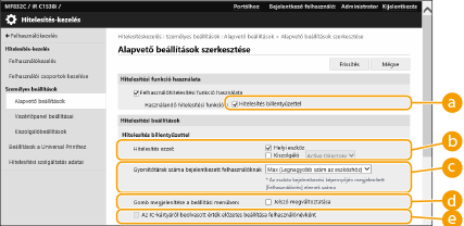 Jelölje be a [Felhasználóhitelesítési funkció használata] lehetőséghez tartozó jelölőnégyzetet, és adja meg a szükséges beállításokat.