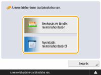 Állítsa az <Lehetőségek választása memória csatlakoztatásakor> beállítást <Be> értékre. Az adathordozó csatlakoztatásakor egy képernyő jelenik meg (mint például az itt látható), és az elérhető funkciók azonnal végrehajthatók. <Lehetőségek választása memória csatlakoztatásakor>