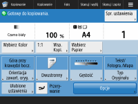 Naciśnij ikonę wyświetlaną na ekranie <Strona główna> oraz ekranie podstawowych funkcji, aby dostosować ekran do własnych potrzeb, np. zmienić układ przycisków lub utworzyć skróty. Dostosowywanie ekranu dotykowego do własnych potrzeb![]() Można zmienić ustawienia ekranu np. który ekran ma być wyświetlany bezpośrednio po włączeniu urządzenia oraz czy mają być wyświetlane komunikaty odnośnie pozostałej ilości papieru i tonera. <Ustawienia wyświetlania> Można ustawić również ekran, który ma być wyświetlany jeżeli po upływie danego czasu nie będzie przeprowadzone żadne działanie. <Funkcja po Automatycz. Ponown. Uruchom.> |