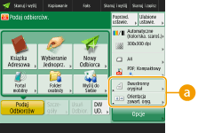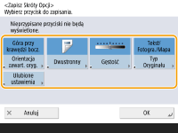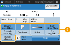 Przyciski ustawień wyświetlane na ekranach Podstawowych funkcji (dla kopiowania, faksowania i skanowania) mogą zostać zamienione na przyciski innych ustawień z menu <Opcje>. Dzięki lokalizacji przycisków często używanych funkcji na ekranie Podstawowych funkcji można wydajniej korzystać z możliwości urządzenia. Ponadto w przypadku logowania z wykorzystaniem zarządzania uwierzytelnianiem prywatnym możliwe jest wyświetlanie innego, spersonalizowanego ekranu Podstawowych funkcji dla każdego użytkownika.