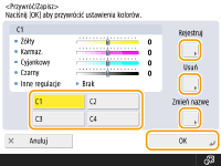 Można zarejestrować do czterech zestawów wyregulowanych ustawień. Po zakończeniu regulacji kolorów naciśnij po kolei opcje <Przywróć/Zapisz> wybierz przycisk od <C1> do <C4> naciśnij przycisk <Zapisz> <Tak> <OK>.![]() ![]() Aby wywołać zarejestrowane ustawienia, naciśnij pozycję <Przywróć/Zapisz>, wybierz przycisk i naciśnij przycisk <OK>. Nazwy przycisków <C1> do <C4> można zmieniać. Aby zmienić nazwę przycisku, wybierz go, naciśnij pozycję <Zmień nazwę>, a następnie wprowadź nową nazwę. Aby usunąć zarejestrowane ustawienia, wybierz przycisk i naciśnij po kolei opcje <Usuń> <Tak>. |