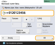 Sprawdzanie całkowitej liczby określonych odbiorcówCałkowita liczba określonych odbiorców jest wyświetlana na górze ekranu. Umożliwia to potwierdzenie przed wysłaniem, czy liczba odbiorców jest prawidłowa. ![]() Aby wysyłać wraz z informacjami o nadawcy.Możesz dołączyć do wysyłki informacje o nazwie nadawcy i numer faksu. <ID Terminala TX> Sprawdzanie statusów wysłanych dokumentówNa ekranie <Monitor stanu>, możesz sprawdzić statusy wysłanych dokumentów. Ten ekran umożliwia ponowne wysyłanie faksów lub anulowanie wysyłania po sprawdzeniu statusów. Sprawdzanie statusu i rejestru wysłanych i odebranych dokumentów Jeżeli dla opcji <Wyświetl powiado. gdy zadanie zostało zaakceptowa.> wybrano ustawienie <On>, ekran <Monitor stanu> można wyświetlić z poziomu poniższego ekranu wyświetlanego po odebraniu wysłanego zadania. <Wyświetl powiado. gdy zadanie zostało zaakceptowa.> ![]() Jeżeli wystąpi błąd transmisji ze względu na to, że linia odbiorcy jest zajętaUrządzenie automatycznie ponowi wybieranie numeru po upływie określonego czasu. Istnieje możliwość zmiany ustawienia liczby ponownych prób łączenia i przerwy między kolejnymi łączeniami. <Automatyczne ponowne wybieranie> Drukowanie raportu wyników wysyłaniaNa ekranie Podstawowych funkcji faksowania, naciśnij kolejno <Opcje> <Raport wyniku TX>, aby ustawić automatyczne drukowanie raportu z listą wyników wysyłania.By ustawić to dla każdego zadania z <Opcje>, należy wybrać <Tylko dla Błędu> lub <Wyłącz> w <Raport wyniku TX>, a następnie ustawić <Zezwól na drukowanie z opcji> na <Włącz>. Jeśli zdjęcia na wysłanym obrazie są zbyt ciemne lub zbyt jasne, kolory w tle kolorowych oryginałów nie mogą zostać usunięteJakość wysłanego obrazu można poprawić, jeśli spełnione są następujące warunki/ustawienia. Rodzaj zadania: Faks (Wysyłanie z pamięci) lub Skanowanie i wysyłanie (Faks/I-faks) <Wybierz Kolor>: <Czarno-biały> (Skanuj i wyślij) <Typ Oryginału>: <Tekst> <Gęstość> <Gęstość Tła>: <Aut.><Rozdzielczość>: 200 dpi x 400 dpi, 300 dpi x 300 dpi*, 400 dpi x 400 dpi lub 600 dpi x 600 dpi* *Może ustawić dla Skanuj i wyślij <Priorytet pręd./jakości obrazu dla czar.-bia. skanów> Faks/I-faks wysłane zadania: <Priorytet Jakości> (<Priorytet pręd./jakości obrazu dla czar.-bia. skanów>) |