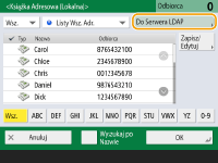 Opcje <Zarej.nowych odbiorców>, <Szczegóły/Edytuj>, <Usuń> i <Zapisz/Edytuj> na ekranie <Książka adresowa (Lokalnie)> mogą służyć do rejestrowania nowych odbiorców, sprawdzania szczegółów oraz edytowania/usuwania odbiorców. Aby korzystać ze Zdalnej książki adresowej, konieczne jest skonfigurowanie ustawień serwera. Zaprogramować zewnętrzny sposób otwierania Zdalnej książki adresowej na serwerze. |