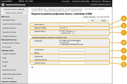 Certyfikaty wygenerowane za pomocą tego urządzenia nie posiadają podpisu CA, co może skutkować błędami komunikacji z niektórymi urządzeniami. Aby żądać certyfikatu z podpisem CA, niezbędne są dane żądania podpisania certyfikatu (CSR). Wyłącznie administratorzy mogą generować CSR.