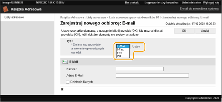 [Ustawienia Osobista lista adresowa/Lista adresowa grupy użytkowników] i wybierz pole wyboru [Zastosuj zmianę nazwy grupy użytkowników do nazwy listy adresowej grupy użytkowników]. [Zastosuj zmianę nazwy grupy użytkowników do nazwy listy adresowej grupy użytkowników] jest dostępny tylko wtedy, gdy włączona jest funkcja zarządzania uwierzytelnianiem prywatnym.