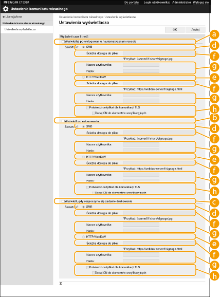 Po ustawieniu funkcji Wiadomości wizualnej można sprawdzić zawartość z poziomu <Wiadomość wizualna> na ekranie (Początek), niezależnie od powyższego harmonogramu.Ustaw plik zapisany na serwerze plików lub w Advanced Box innej drukarki wielofunkcyjnej firmy Canon w tej samej sieci co zawartość do wyświetlenia. Używanie innych urządzeń i nośników pamięci Jako zawartość wyświetlaną przez serwer proxy można również ustawić stronę internetową. Ustawienia proxy używane dla tej funkcji są tożsame z ustawieniami w <Ustawienia Proxy>. Zawartość jest wyświetlana po rozpoczęciu drukowania, jeśli włączona jest funkcja drukowania z wymuszonym wstrzymaniem, a pole wyboru [Display When Print Job Starts] jest zaznaczone. |