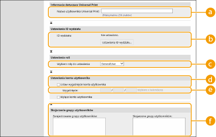 [Nazwa użytkownika Universal Print:]Jeżeli opcja [Ustawienia/Rejestracja]