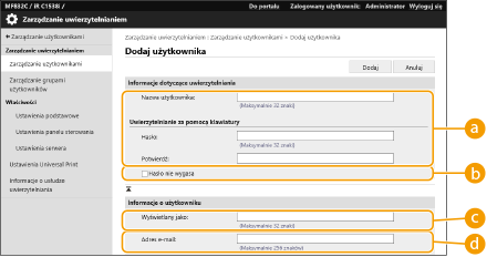 [Hasło nie wygasa]Zaznacz pole wyboru, aby ustawić hasło użytkownika, który ma być zarejestrowany do braku ustawienia daty ważności. Można wybierać to ustawienie, gdy dla opcji [Ustaw okres ważności hasła] wybrano ustawienie [Wyłącz] w [Zasada ustawień hasła] na ekranie [Uwierzytel.] w [Ustawienia zasad zabezpieczeń].