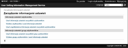 Możesz również zdecydować, czy dane ustawień użytkowników będą usuwane automatycznie po osiągnięciu maksymalnej ilości danych, która może zostać zarejestrowana. <Akcja przy przekro. maksymalnej ilości użytkowników> Informacje na temat maksymalnej ilości danych ustawień użytkowników, która może zostać zarejestrowana, patrz Specyfikacje systemu. Informacje o ustawieniach użytkownika, które Usługa zarządzania informacjami o ustawieniach użytkownika może łączyć z Uwierzytelnianiem użytkownika przedstawione zostały poniżej: Informacja dotycząca przycisków prywatnych/publicznych (Rejestrowanie często używanych ustawień i odbiorców jako przycisków osobistych/współdzielonych na ekranie <Początek>) Informacje na temat pęku kluczy (Zarządzanie użytkownikami) |