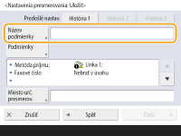 Výberom položky <Presmer. bez podmienok> môžete presmerovať všetky prijaté dokumenty, ktoré nespĺňajú špecifikované podmienky, do požadovaného miesta určenia. Môžete nastaviť presmerovanie do viacerých miest určenia špecifikovaním skupinového miesta určenia v časti <Miesto urč. presmerov.>. Nastavenie <Špecif. čas presmerov.> umožňuje špecifikovať čas a deň presmerovania. Ak nastavíte možnosť <Hlás. o dok. presmer.>, môžete dostávať e-mailové oznámenia o dokončení presmerovania dokumentov. V prípade výberu možnosti <Hlás. len pri chybe> nebudete dostávať oznámenia o úspešnom presmerovaní. Ak nastavíte položku <Uložiť/Tlačiť prijatý súbor> na možnosť <Zap.>, budete môcť uložiť alebo vytlačiť prijatý súbor podľa nastavení zámky pamäte. Prijatý súbor sa uloží, ak je zámka pamäte nastavená na možnosť <Zap.>, a vytlačí sa, ak je zámka pamäte nastavená na možnosť <Vyp.>. |