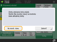 Kontrola celkového počtu špecifikovaných miest určeniaCelkový počet špecifikovaných miest určenia sa zobrazuje v hornej časti obrazovky. Umožňuje overiť pred odoslaním, či je počet miest určenia správny. Odoslanie s informáciami o odosielateľoviKontrola stavov odoslaných dokumentovKeď je položka <Zobraziť upozornenie, keď je prijatá úloha> nastavená na možnosť <Zap.>, obrazovku <Monitor stavu> je možné zobraziť z nasledujúcej obrazovky, ktorá sa otvorí po prijatí odoslanej úlohy. <Zobraziť upozornenie, keď je prijatá úloha>Tlač správy s výsledkami odosielaniaAk to chcete nastaviť pre všetky úlohy z položky <Voľby>, je potrebné vybrať možnosť <Len pri chybe> alebo <Vyp.> v položke <Hlásenie o výsledku VYS.> a potom nastaviť položku <Povoliť tlač z možností> na možnosť <Zap.>. Zabezpečené odosielanie súborovAk sú fotografie v odoslanom obraze príliš tmavé alebo ak svetlé farby na pozadí farebných originálov nie je možné odstrániťKvalitu odoslaného obrazu možno vylepšiť splnením nasledujúcich podmienok/nastavení. Typ úlohy: Fax (Odosielanie z pamäte) alebo Skenovať a odoslať (Fax/I-fax) <Vybrať farby>: <ČB> (Skenovať a odoslať) <Typ originálu>: <Text> <Sýtosť> <Sýtosť pozadia>: <Auto> <Rozlíšenie>: 200 dpi × 400 dpi, 300 dpi × 300 dpi*, 400 dpi × 400 dpi alebo 600 dpi × 600 dpi* *Je možné nastaviť pre funkciu Skenovať a odoslať |
