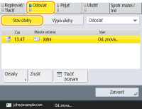Stlačením tlačidla <Detaily> <Odoslať znova> môžete znova odoslať, resp. uložiť dokumenty, ktoré sa neodoslali, resp. neuložili úspešne. Ak chcete špecifikovať iné miesto určenia, stlačte tlačidlo <Zmena miesta urč.>. V prípade dokumentov s viacerými miestami určenia špecifikovanými pomocou rovnakej metód odosielania, resp. ukladania stlačte tlačidlo <Zoznam vysielania>, vyberte miesto určenia a potom stlačte tlačidlo <Odoslať znova> alebo <Zmena miesta urč.>.Dokumenty môžete znova odoslať, resp. uložiť, keď je položka <Zmazať chybné úlohy VYS.> nastavená na možnosť <Vyp.>. <Zmazať chybné úlohy VYS.> Môžete zmeniť miesta určenia dokumentov, ktoré sú nastavené na odoslanie, resp. uloženie v špecifikovanom čase, ako aj dokumentov, ktoré sa neodoslali, resp. neuložili úspešne. Upozorňujeme, že miesta určenia nemôžete meniť pre odosielané, resp. ukladané dokumenty so špecifikovanými viacerými miestami určenia a tiež prípade, ak je obmedzené zadávanie nových miest určenia (Obmedzenie nových miest určenia). |
