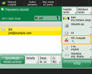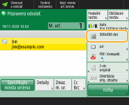 Kontrola celkového počtu špecifikovaných miest určeniaCelkový počet špecifikovaných miest určenia sa zobrazuje v pravej hornej časti obrazovky. Umožňuje overiť pred odoslaním, či je počet miest určenia správny. Okamžité zrušenie úlohy, ktorá sa odosielaAk na ovládacom paneli stlačíte tlačidlo  (Stop) počas odosielania úlohy, zobrazí sa správa <Súhlasíte so zrušením nasledujúcej úlohy odoslania?>. Stlačením tlačidla <Áno> zrušíte odosielanie. Ak sa odosiela viac úloh, stlačením tlačidla  (Stop) zobrazíte obrazovku, na ktorej môžete vybrať úlohu, ktorá sa má zrušiť. Ak sa nezobrazuje úloha na odoslanie, ktorú chcete zrušiť, stlačením tlačidla <Skontr. ostatné úlohy> zobrazte položku <Odoslať úlohy>. Vyberte úlohu, ktorú chcete zrušiť, a stlačte tlačidlo <Zrušiť>. Kontrola stavov odoslaných, resp. uložených dokumentovStavy odoslaných, resp. uložených dokumentov môžete skontrolovať na obrazovke <Monitor stavu>. Táto obrazovka umožňuje znova odoslať, resp. uložiť dokumenty alebo zrušiť odosielanie, resp. ukladanie po vykonaní kontroly stavov. Kontrola stavu a denníka naskenovaných dokumentovKeď je položka <Zobraziť upozornenie, keď je prijatá úloha> nastavená na možnosť <Zap.>, obrazovku <Monitor stavu> je možné zobraziť z nasledujúcej obrazovky, ktorá sa otvorí po prijatí odoslanej úlohy. <Zobraziť upozornenie, keď je prijatá úloha>Tlač správy s výsledkami odosielania, resp. ukladaniaNa obrazovke základných funkcií skenovania môžete stlačením tlačidla <Voľby>  <Hlásenie o výsledku VYS.> automaticky vytlačiť správu so zoznamom výsledkov odosielania, resp. ukladania. Ak to chcete nastaviť pre všetky úlohy z položky <Voľby>, je potrebné vybrať možnosť <Len pri chybe> alebo <Vyp.> v položke <Hlásenie o výsledku VYS.> a potom nastaviť položku <Povoliť tlač z možností> na možnosť <Zap.>. Názov súboruKeď sa súbor odošle, resp. uloží, názov daného súboru sa vygeneruje automaticky na základe nasledujúceho formátu. Nastavenie môžete zmeniť tak, aby sa dal priradiť iný názov. Nastavenie názvu súboruV prípade odosielania e-mailom Formát: „číslo úlohy (štvorciferné)_číslo strany (trojciferné).prípona súboru“, napríklad „1042_001.jpg“ V prípade ukladania do súborového servera Formát: „rok, mesiac, deň, hodina, minúta a sekunda uloženia súboru (14-ciferné).prípona súboru“, napríklad „20151030133541.jpg“ Predmet e-mailu |