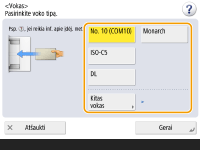 1 | Paspauskite <Vokas>. Informacijos ekrane <Popieriaus tipas> negalima pasirinkti voko popieriaus tipo. Norėdami pasirinkti voko popieriaus tipą, užregistruokite popieriaus tipą punkte <Parank. pop. registravimas (universalus dėklas)>, tada paspauskite <Parankinis popierius> (atlikdami 2 veiksmą) mygtuką, kuriam buvo užregistruotas popieriaus tipas <Gerai>. Universaliajame dėkle dažnai naudojamo popieriaus formato ir tipo registravimas |