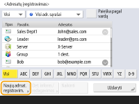 ![]() | Jūs galite adresų knygoje registruoti gavėjo fakso numerį ar el. pašto adresą, kuriais galima pasinaudoti siunčiant nuskaitytus dokumentus. Taip pat adresų knygoje kaip adresatą galite registruoti internetinės faksogramos adresatą, failo serverio aplanko vietą (IP adresą ir kelią) ir „Canon“ daugiafunkcio spausdintuvo saugojimo vietą (Išplėstinė sritis). |
