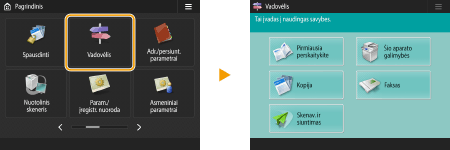 Peržiūrėti funkcijos gidąPaspauskite <Vadovėlis>, kad iškviestumėte ekraną, kuriame susipažinsite, kaip naudotis aparato funkcijomis, taip pat gausite patarimų dėl kopijavimo, nuskaitymo ir t. t. Peržiūrėkite šį ekraną, kai norėsite daugiau sužinoti apie esamas funkcijas bei kaip jomis naudotis. ![]() Pavyzdys: Kopijavimo funkcijų mokomoji priemonė Pasirenkant elementą iš sąrašo rodomas mokomasis ekranas. ![]() Naudoti Pagalbos funkcijąPriklausomai nuo to, kokia funkcija rodoma, kartais rodomas viršutiniame dešiniajame ekrano kampe. Paspauskite , kad pažymėtumėte aprašą ir funkcijos operacijos metodą.![]() Paspauskite <Baigti>, jei norite grįžti į ankstesnį ekraną. Valdykite taip, kaip išmanųjį telefoną (brūkštelėkite / nuvilkite ir numeskite).Kai kuriuose ekranuose galite perjungti puslapį ar slinkti juo brūkštelint ekranu viršun / žemyn arba kairėn / dešinėn taip, kaip išmaniajame telefone. ![]() ![]() Taip pat galite išjungti brūkštelėjimo operacijas. <Vald. funkcijos naudojimas> Brūkštelėjimo ir nuvilkimo bei numetimo veiksmų negalima naudoti, kai <Ekrano spalvų sukeitimas> nustatytas į <Įjungt.>. <Ekrano spalvų sukeitimas> Ekranuose su judančiais mygtukais mygtukus galima perkelti nuvelkant ir numetant. ![]() |