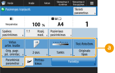Parametrų mygtukus, rodomus pagrindinių funkcijų ekrane (kopijavimo, faksogramų siuntimo ir nuskaitymo užduotims), galite pakeisti kitais mygtukais punkte <Parinktys>. Pagrindinių funkcijų ekrane rasdami dažnai naudojamų parametrų mygtukus galėsite veiksmingiau pasinaudoti funkcijomis. Be to, jei prisijungiama naudojantis tapatybės patvirtinimo valdymu, galima rodyti skirtingą pagrindinių funkcijų ekraną, pritaikytą kiekvienam vartotojui.