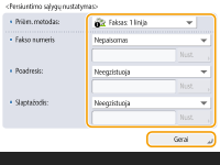 Negalite keisti <Receive Method> užregistravę <Persiuntimo parametrai>. Norėdami naudoti persiuntimo parametrus, kai pakeistas <Receive Method>, turėsite dar kartą užregistruoti persiuntimo parametrus. |