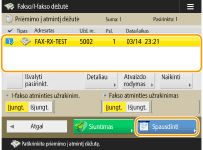 Paspaudę <Detaliau> galėsite patikrinti informaciją apie dokumentą, įskaitant siuntėjų vardus ir gautų puslapių skaičių. Paspaudę <Atvaizdo rodymas> galėsite patikrinti dokumento turinį, taip pat pasirinkti ir panaikinti puslapius.