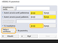 Aparatas ir autentifikavimo serveris autentifikuoja vienas kitą abipusiškai siųsdami sertifikatus. Aparate turi būti užregistruotas CA sertifikatas, kad patvirtintų sertifikatą (serverio sertifikatą), siunčiamą iš autentifikavimo serverio. Papildomai šiame parametre turi būti nurodytas PKCS#12 formato raktas ir sertifikatas (kliento sertifikatas), kad autentifikavimo serveris galėtų autentifikuoti aparatą. Šiuos elementus užregistruokite prieš konfigūruodami parametrus (