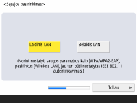Nurodykite aparato prijungimo prie tinklo metodą. ![]() ![]() Galite pasirinkti aparato prijungimo prie kompiuterių ir kitų įrenginių metodą. Pasirinkite norimą naudoti prijungimo metodą ir paspauskite <Toliau>. Jei pasirinkote <Laidinis LAN>, pereikite prie 7 veiksmo. Prireikus informacijos apie tinklo prijungimo metodus, žr. Tinklo prijungimo metodo pasirinkimas. ![]() Jei pasirinkote <Belaidis LAN>, nurodykite belaidžio LAN parametrus. ![]() Prireikus išsamios informacijos apie belaidžius LAN ryšius, žr. Prisijungimas prie belaidžio LAN. | |