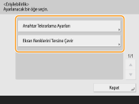 Bir düğme basılı tutulduğunda tekrarlı olarak aynı karakterin girildiği hızı değiştirmek için <Anahtar Tekrarlama Ayarları> seçeneğine basın. Bu ayar, kullanıcıların giriş işlemlerini yavaş bir şekilde gerçekleştirirken aynı karakteri yanlışlıkla birçok kez girmesini önleyebilir.