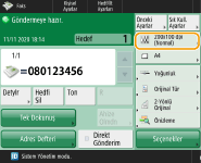 Belirlenen hedeflerin toplam sayısını kontrol etmek içinBelirlenen hedeflerin toplam sayısı ekranın üst kısmında görüntülenir. Bu, göndermeden önce hedef sayısının doğru olduğunu onaylamanızı sağlar. ![]() Gönderici bilgisiyle göndermek içinGöndericinin adını ve faks numarasıyla gönderebilirsiniz. <İletim Terminal Kimliği> Gönderilen belgelerin durumlarını kontrol etmek için<Durum Dentlm> ekranında, gönderilen belgelerin durumlarını kontrol edebilirsiniz. Bu ekran, durumlarını kontrol ettikten sonra faksları tekrar göndermenizi veya göndermeyi iptal etmenizi sağlar. Gönderilen ve Alınan Belgeler için Durum ve Günlüğü Kontrol Etme <İş Kabul Edildiğinde Bildirim Görüntüle> seçeneği <On> olarak ayarlandığında, bir gönderim işi alındıktan sonra gösterilen aşağıdaki ekranda <Durum Dentlm> ekranı görüntülenebilir. <İş Kabul Edildiğinde Bildirim Görüntüle> ![]() Alıcının hattının meşgul olmasından kaynaklanan bir iletim hatası oluştuğundaBelirli bir sürenin ardından makine otomatik olarak yeniden arama yapar. Makinenin kaç kez yeniden arama yapacağını ve yeniden aramalar arasındaki süre gibi ayarları değiştirebilirsiniz. <Otomatik Yeniden Ara> Gönderme sonuçlarına rapor yazdırmak içinFaks Temel Özellikleri ekranında, <Seçenekler> <İletim Sonucu Raporu> seçeneğine bastığınızda, gönderme sonuçlarının rapor listesini otomatik olarak yazdırmak üzere ayarlayabilirsiniz.Bunu her iş için <Seçenekler> bölümünde ayarlamak üzere, <İletim Sonucu Raporu> öğesinde <Sadece Hata İçin> veya <Kapalı> seçeneğini belirlemeniz ve daha sonra <Seçeneklerden Yazdırmaya İzin Ver> seçeneğini <Açık> olarak ayarlamanız gerekir. Gönderilen görüntüdeki fotoğraflar çok koyu olduğunda veya renkli orijinallerin arka planındaki açık renkler kaldırılamadığındaAşağıdaki koşullar/ayarlar karşılanırsa, gönderilen görüntünün kalitesi iyileştirilebilir. İş türü: Faks (Hafızadan Gönderme) veya Tara ve Gönder (Faks/I-faks) <Renk Seç>: <Siyah/Beyaz> (Tara ve Gönder) <Orijinal Tür>: <Metin> <Yoğunluk> <Arkaplan Yoğunluğu>: <Oto><Çözünürlük>: 200 dpi x 400 dpi, 300 dpi x 300 dpi*, 400 dpi x 400 dpi veya 600 dpi x 600 dpi* *Tara ve Gönder için ayarlanabilir <Siyah/Beyaz Tarama İçin Hız/Görüntü Kalitesi Önceliği> Faks/I-Faks Gönderim İşleri: <Kalite Önceliği> (<Siyah/Beyaz Tarama İçin Hız/Görüntü Kalitesi Önceliği>) |