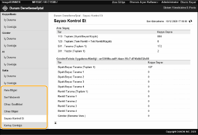 Hata bilgileri, kalan kağıt ve toner miktarı, takılı isteğe bağlı ekipmanlarla ilgili bilgi ve şimdiye kadar yazdırılan toplam sayfa sayısı gibi makine hakkındaki çeşitli bilgileri denetleyebilirsiniz.